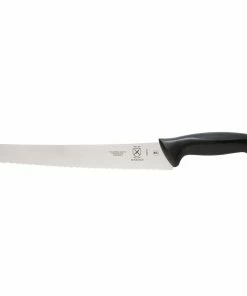 Enjoy delicious meals with ease using the Mercer Genesis Serrated Steak Knife Set. This set of six knives is an Everything Kitchens exclusive. Each blade is forged from high carbon German steel and NSF certified, so they are at home in both professional and home kitchens. The Genesis steak knives feature an ergonomic handle, black with silver accents that are as comfortable to use as they are beautiful to look at. Designed with a serrated blade, these knives are perfect for slicing up anything from steak apple slices to sandwiches. This versatility makes the Everything Kitchens exclusive Genesis Steak Knife Set a must-have for your cutlery collection.