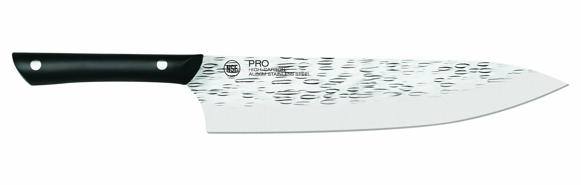 NSF-certified for use in commercial kitchens, Kai PRO knives are made of Japanese AUS6M high-carbon stainless steel and hand sharpened to a 16° edge on each side. Full-tang with a double-riveted handle, the PRO series knives are built to stand up to daily, professional use. The striking hammered blade finish is beautiful, but even more; it reduces drag and helps food release from the blade easily. With a limited lifetime warranty, you can count on the precision performance this Kai PRO knife will bring to your prep work.