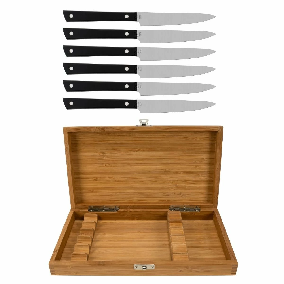 Easily slice through tender, homecooked steaks with the Kai PRO 6-Piece Steak Knife Set. This set includes six steak knives that are crafted with sharp straight 5.25″ blades that’ll easily cut through steak in a single pass, ensuring more of the juices and flavor stay inside the meat. NSF-certified for use in commercial kitchens, these steak knives are made with Japanese 420J2 stainless steel double-bevel blades that have a beautiful grazed finish for a striking look. Each knife is hand sharpened to a 16° edge on each side and has a full-tang double-riveted handle for comfort & control. The PRO series knives are built to stand up to daily, professional use and are backed by a limited lifetime warranty ensuring they last years of use. This set also comes with an elegant bamboo presentation box to keep them safely stored when not in use.