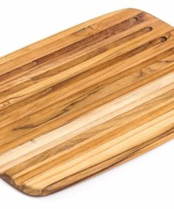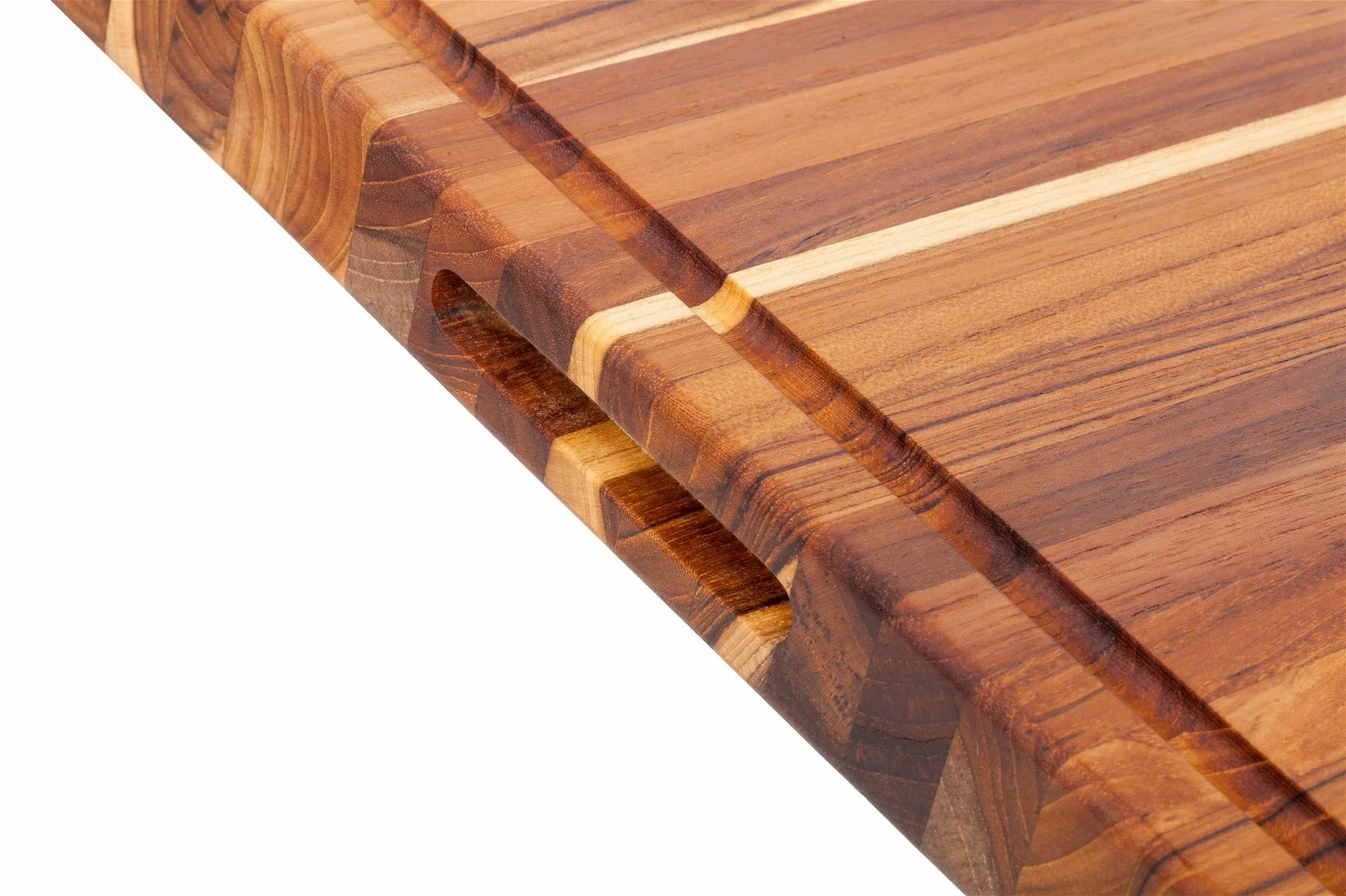 With a durable and elegant edge grain surface that’s resistant to splitting and warping, this superior cutting board can be used daily without dulling your knives or losing its smooth, flat surface. This hefty board has a sturdy weight that won’t slip while in use and features integrated hand grips for easy movement around the kitchen. Plus, it has a built-in juice canal along the border to catch excess liquids from ripe tomatoes, juicy meats, and more, so your work surface stays clean and organized while preparing food. With the perfect balance of functionality and style, the TeakHaus Edge Grain Cutting Board will quickly become your favorite tool for all your prepping and cutting needs!