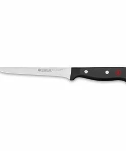 De-bone a chicken, fillet salmon or fish, or butcher any other game with the Wusthof Gourmet 5″ Boning Knife. The long narrow curved blade allows the knife to move along the bones for a precise cut. The laser-cut stamped blade is constructed of high-carbon, stain-resistant steel & is triple-riveted to the black synthetic handle. The straight edge blade provides a smooth, clean, exact cut & can be used on a variety of meat, vegetables & fruits. Craftsmanship & durability are important factors in choosing the right knife. Wusthof is a family-owned company who has been manufacturing knives & cutlery for over 200 years in Solingen, Germany – also known as the “City of Blades”.